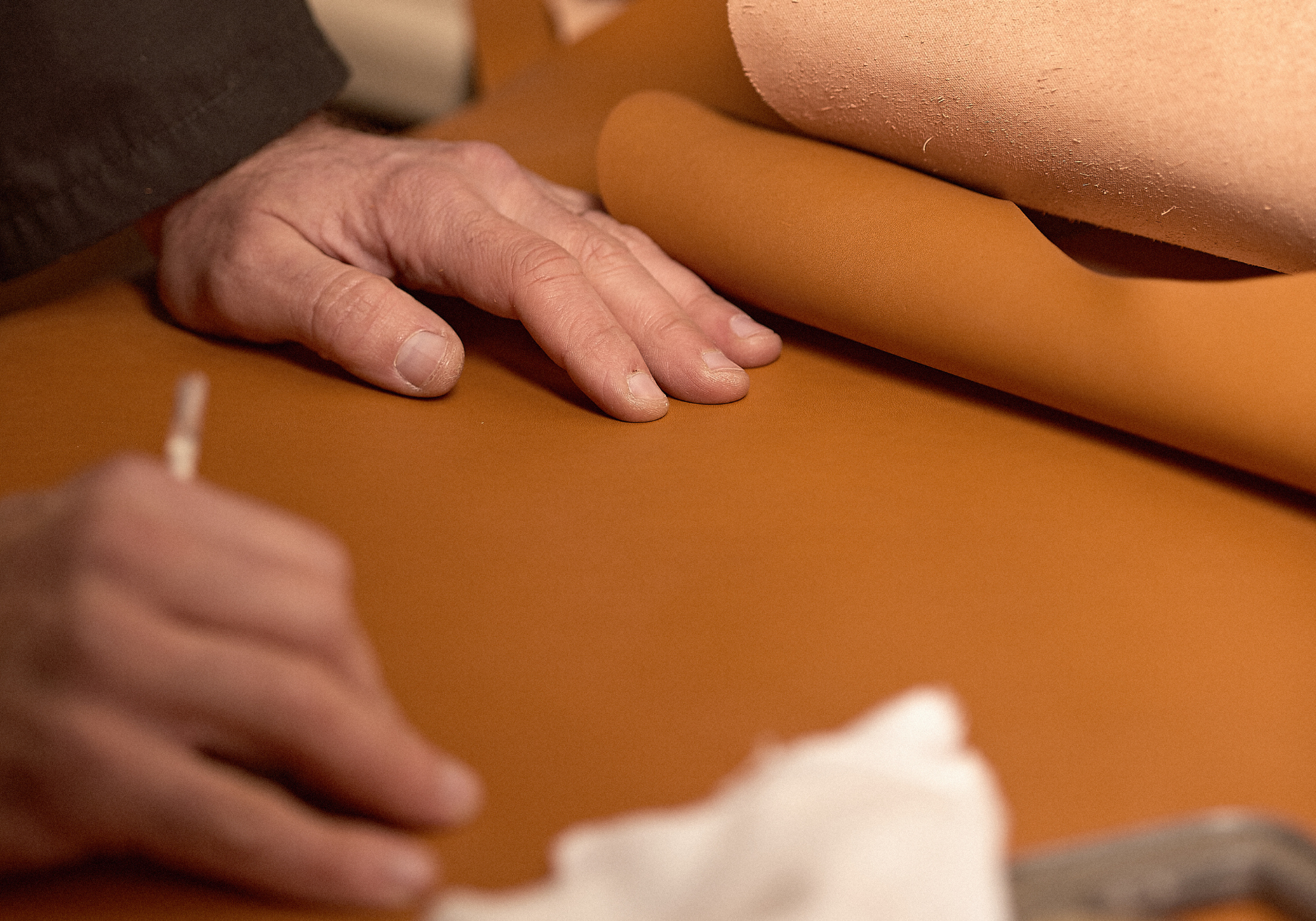 Each piece of leather is hand-cut by our artisans, ensuring precision and quality in every step. We use only the finest, sustainably sourced leather from eco-friendly tanneries in Europe, renowned for their sustainable practices and high-quality leather.