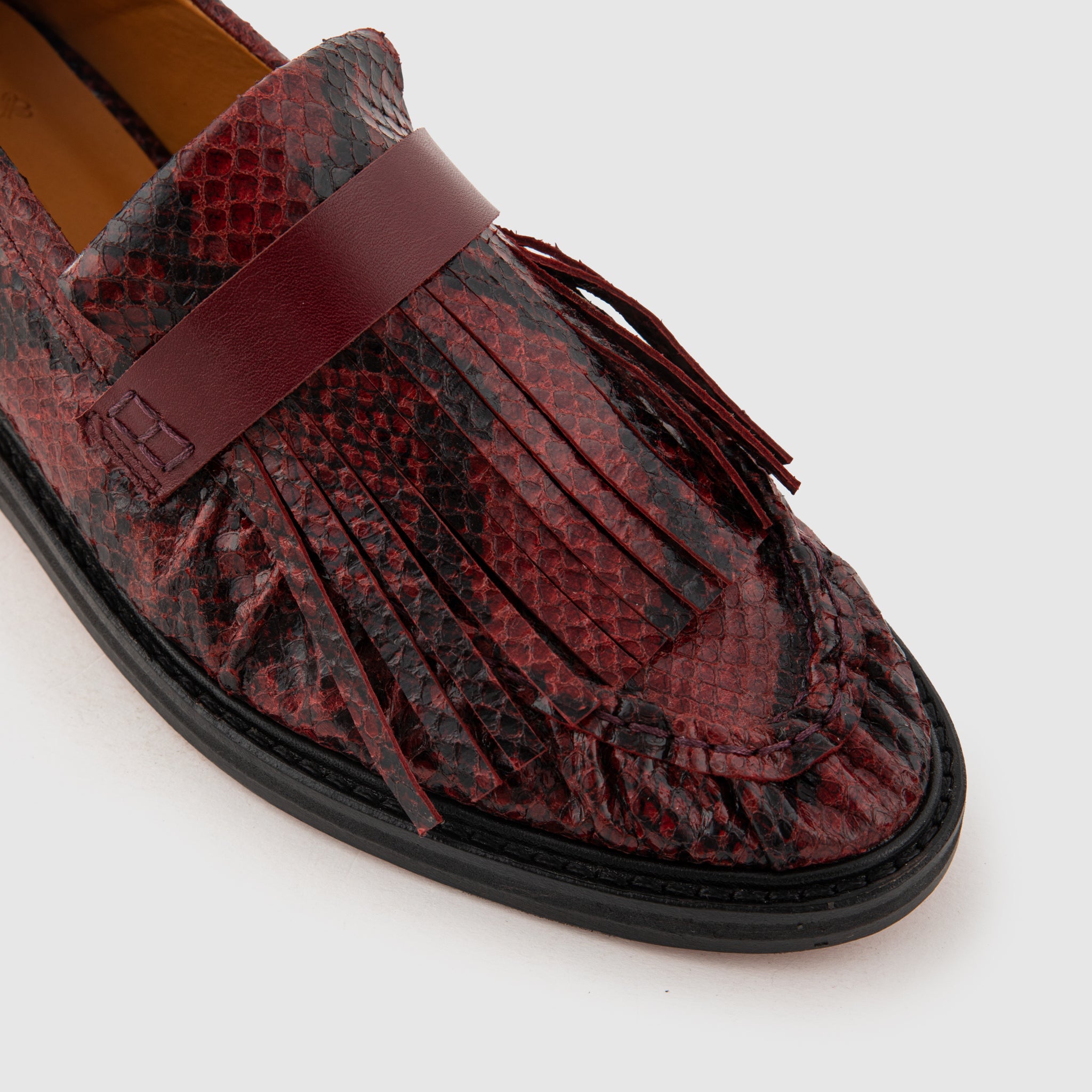 Uma versão arrojada do clássico mocassim, confecionada em pele de alta qualidade com um sofisticado efeito de pele de cobra. Os tons contrastantes de cor vinho e preto criam uma rica textura visual, realçada por uma franja delicada e feita à mão. Esta peça de destaque eleva sem esforço qualquer guarda-roupa smart-casual, com uma sola flexível e respirável para conforto durante todo o dia.